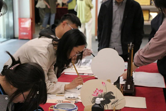 隨后,董倩倩老師和丁一蘭老師通過生動的講解和精湛的演示,現場教授了漆扇的制作方法和扇面的書寫技藝。同時,也讓參與活動的師生們親身體驗了非遺文化的魅力。