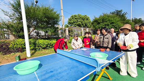 有趣的是青蛙跳水:“乒乓球”代表青蛙,將乒乓球丟到乒乓球臺(tái)面,彈起后越過網(wǎng)落入盆中,8個(gè)球有4個(gè)以上落入盆中有獎(jiǎng)。剛開始有的老師手力大小沒“掐準(zhǔn)”,青蛙跳水不成功。再有“經(jīng)驗(yàn)”后,參賽選手那青蛙跳水“準(zhǔn)準(zhǔn)”的,讓沒參與此項(xiàng)目的選手很羨慕。