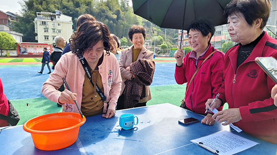 看,快夾跳棋:在一分鐘內(nèi),用筷子將五種顏色混合一起的跳棋從一個(gè)盆中夾到另一個(gè)杯中,每種顏色至少一粒,總數(shù)10粒以上有獎(jiǎng)。有的老人緊張得手在抖,跳棋一下滑溜了;也有運(yùn)動(dòng)員一伸筷子就穩(wěn)穩(wěn)夾住了珠珠,并按不同顏色分放入杯中,一分鐘未到,已穩(wěn)操勝券。
