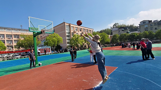 瞧,定點(diǎn)投籃:罰球線外定投6個(gè)球,投進(jìn)2個(gè)球(含2個(gè))以上有獎(jiǎng)。有的運(yùn)動(dòng)員一投一個(gè)準(zhǔn)地進(jìn)球超2個(gè),有的剛好進(jìn)2個(gè),還有的球“不乖”,只進(jìn)1個(gè)。旁邊人都眼隨著那拋出的籃球,巴不得手臂變“長”幫球“按”入網(wǎng)中。運(yùn)球、跳躍、上籃……考驗(yàn)著銀齡教師打籃球“功夫”了。