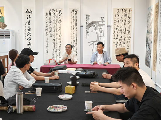 楓江書畫社社長、古越書畫院副院長兼秘書長魏仁虎主持會議,代表楓江書畫社全體社員同仁,對古越書畫院書畫家們的到來,表示熱烈的歡迎!指出“專業從事或業余愛好書畫,學習、臨摹和創作,不光是一項體力活,更是一項腦力勞動!在辛勤耕耘中,有痛苦和煩惱的同時,也收獲著快樂!”楓江書畫社與古越書畫院,一直有著密切的關系,有七位是兩棲社員。規模性交流活動是第一次。希望以后有更多的機會交流、切磋和學習!分別介紹了兩個書畫社。楓江書畫社:成立于2003年1月,現有社員102人,其中中國書法家協會會員3人,浙江省書法家協會、美術家協會會員12人,紹興市級會員8人,諸暨市級會員25人,社長魏仁虎,副社長駱恒天、李堯云、王仲章(兼秘書長)、阮洪法、錢鴻波。一直聘請葛煥標中將、駱恒光先生為名譽社長,深受政府和上級主管部門好評,具有一定的社會影響力。多次被諸暨市文化和旅游局、諸暨市民政局評為先進社會團體。古越書畫院:2014年9月注冊成立。聘請楊爾、許洪流、陳泉永為顧問,許紹滿、樓有剛、蔡棟、楊曙、吳玉女為名譽院長,聘任濮承三為院長,金康華、徐國萍、魏仁虎(兼秘書長)為副院長。現有社員35人,其中:中共黨員12人,中國美術家協會、中國書法家協會會員10人,浙江省書法家協會會員18人。創辦了《古越藝叢》刊物,面向社會發行,傳承古越文化,弘揚中華文明,立足越地,面向全國。