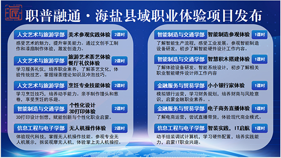 為推進“職業啟蒙”教育,推動職業理念、職業技能、職業素養與普通教育相互融通,海鹽職業教育中心特組織開展2025年度“職普融通示范日”活動。