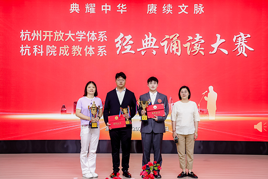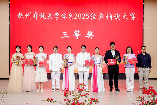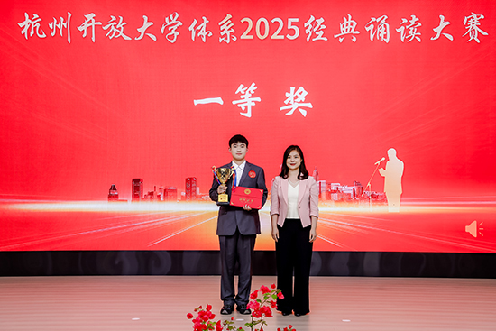 近日,以“典耀中華 賡續文脈”為主題的杭州開放大學體系經典誦讀大賽在杭州隆重舉行。來自全市開放大學體系的眾多選手同臺競技,以聲傳情、以誦抒懷,展現中華經典文化的永恒魅力。經過激烈角逐,浙江開放大學臨平學院脫產班24電商吳昊澤同學憑借出色的表現脫穎而出,榮獲大賽一等獎第一名;22秋學前開放教育本科張學楠獲第四名;脫產班25電商趙俊杰獲得第五名的好成績;我院步紅梅老師獲得該賽項唯一一個優秀指導老師獎,師生攜手為學校贏得了榮譽。