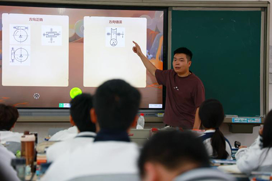 楊宏博老師的《輪系復習課》以學考真題串聯知識體系,幫助學生掌握定軸輪系、行星輪系的傳動比計算與轉向關系。課上,楊老師設計“齒輪方向判斷”“傳動比計算”等互動游戲,學生限時完成計算并匹配考點,鞏固核心知識,鍛煉空間想象力。學生們踴躍參與手勢操演算,領略機械傳動之美,深化對運動合成與動力傳遞邏輯的理解,為后續機械系統設計課程積淀了扎實的思維動能。