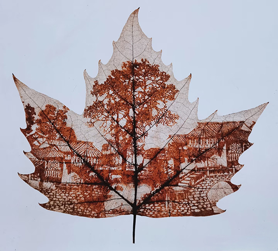 葉雕,又稱剪葉,取材秋季成熟的自然落葉,經手工雕琢而成精美的圖案。制作葉雕的工藝復雜,精選后的樹葉要經過揉制、修剪、錘壓、浸泡、雕刻、研磨、熨燙、漂白等60多道工序,運用繪畫、微刻、剪紙、書法、篆刻等工藝,經3—4個月的時間才能制成可觀賞和收藏的葉雕作品。葉雕薄如蟬翼,色澤自然,耐酸、堿、潮濕,具有葉黃而不脆、筋絡彎曲而不斷等特征。2023年12月,被列入第八批海鹽縣非物質文化遺產名錄。