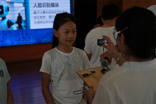 隨后,沈亞?wèn)|老師及創(chuàng)客團(tuán)隊(duì)的同學(xué)們帶著智能測(cè)溫臺(tái)(利用語(yǔ)音合成技術(shù))、智能自動(dòng)窗(語(yǔ)音識(shí)別、語(yǔ)音合成技術(shù))、AI智能測(cè)油溫機(jī)(利用語(yǔ)音合成及圖像識(shí)別技術(shù))、“甲烷生成的新篇章”(圖像識(shí)別、語(yǔ)音識(shí)別、語(yǔ)音合成)等智能小發(fā)明,讓孩子們親身參與體驗(yàn)科技帶來(lái)的樂(lè)趣,孩子們躍躍欲試,驚訝地表示:哇!這個(gè)機(jī)器居然聽(tīng)得懂我的指令哦!太神奇了!孩子們眼睛里閃爍著好奇與興奮的光芒。