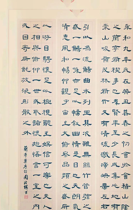 新學期伊始,書法班章高鈞老師宣布本學期我們將學寫王羲之《蘭亭序》時,教室里頓時響起一片驚嘆。老學員們聽聞后很開心,有一種迫切想提筆書寫的心情。但像我們這種連毛筆都還沒摸穩(wěn)的“菜鳥”也能上手學寫《蘭亭序》嗎? “能”。章老師給出了肯定的答復,“蘭亭序是書法學習者的必修范本,這學期大家一起慢慢寫,會寫的、不會寫的,都一個字一個字認真地學”。