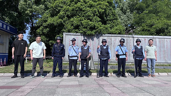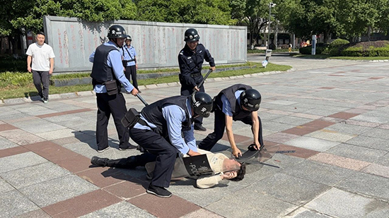 演練以“歹徒持械強行闖入校園”為模擬情境。一名“不法分子”企圖闖入校園,安保員立即啟動應急預案,迅速響應。報警系統觸發后,保安隊員手持防暴盾牌、鋼叉組成防御隊形,與“歹徒”周旋,3分鐘內合力制服“歹徒”。整個流程緊張有序,保安員們配合默契。