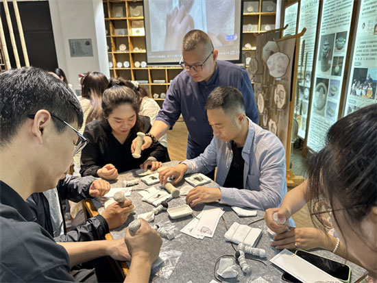 行程最后一站,學員們赴杭州市求知小學觀摩傳統工藝與校園美育融合的校園博物館“片廬”。浙江省杭州市拱墅區級非物質文化遺產“錦灰堆拓技藝”代表性傳承人、校黨總支副書記趙士華作《古陶瓷標本校園博物館的美育》講座,系統介紹了“將博物館資源轉化為課程資源”的創新實踐模式,為校園美育特色建設提供了新思路。隨后,學員們實地參觀了館中陳列的古瓷片、畫像石、瓦當,師生創作的扎染、堆拓的文創產品等。最后學員們體驗了古陶瓷紋樣拓片書簽制作,親身感受傳統工藝與現代美育的融合魅力。