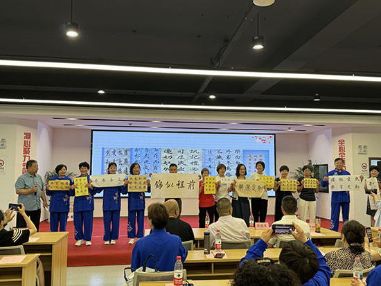 在“藝韻流芳”篇章中,來傳良渾厚的《人生沒有回頭路》唱出歲月沉淀的智慧,健身氣功班學(xué)員以《八段錦》演繹天人合一的東方哲學(xué),而書法班教師孫初亮帶領(lǐng)學(xué)員現(xiàn)場展示作品彰顯翰墨風(fēng)骨,一幅幅遒勁大字如銀鉤鐵畫,筆墨游走處,是老年群體對傳統(tǒng)文化的守護(hù)與創(chuàng)新。