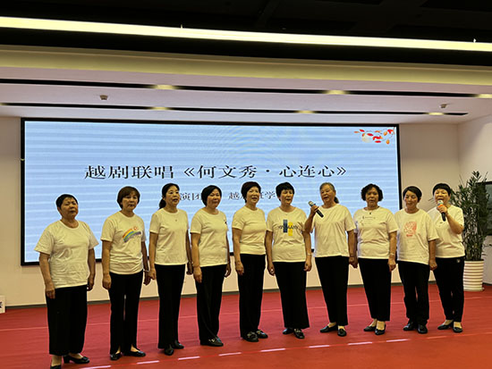 壓軸登場的《何文秀·心連心》十人聯(lián)唱,將整場展演推向高潮。學(xué)員們以戲腔唱響“社區(qū)共建心連心”,在百年越劇的婉轉(zhuǎn)旋律中注入新時代社區(qū)精神。當(dāng)十位銀發(fā)表演者攜手謝幕時,舞臺仿佛化作跨越時空的橋梁——一頭連著戲曲博物館里的珍貴戲服,一頭通向智慧社區(qū)里的數(shù)字課堂。