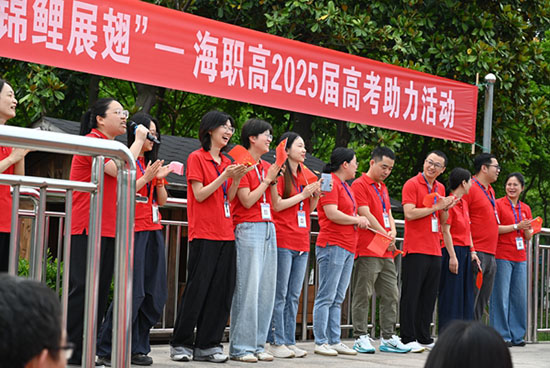 當(dāng)《奇跡再現(xiàn)》的旋律響起,跑道兩側(cè)的學(xué)弟學(xué)妹們高舉各班的口號(hào)橫幅,紅色的勵(lì)志帶在風(fēng)中獵獵作響。高三學(xué)子邁著堅(jiān)定的步伐向前奔跑,當(dāng)他們沖刺躍過(guò)“龍門”時(shí),跑道旁的老師們?yōu)閷W(xué)生們送上最熱烈的吶喊。高二學(xué)弟學(xué)妹們則將準(zhǔn)備好的祝福卡片和小禮物塞進(jìn)學(xué)長(zhǎng)學(xué)姐手中,紙短情長(zhǎng),滿是祝福。“海職高!加油!海職高!必勝!”的吶喊聲響徹云霄,如同一曲激昂的戰(zhàn)歌。