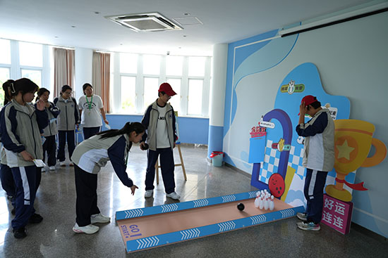 本次游園會設置了六大特色體驗區。在“微笑驛站”,同學們在拍照框前定格青春笑臉;“煩惱保齡球”區域,擊倒標有“考試焦慮”“人際困擾”的球瓶,幫助釋放壓力;“積極能量瓶”制作區,學生們專注創作勵志書簽,22藝術設計1蔡珂珂表示:“這個書簽會時刻提醒我保持積極心態。”