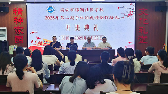 5月22日上午,瑞安市錦湖社區(qū)學(xué)校多功能廳內(nèi)座無虛席,由該校與溫州市弘澤職業(yè)技能培訓(xùn)學(xué)校聯(lián)合舉辦的第二期短視頻制作專項(xiàng)技能培訓(xùn)班正式開班。瑞安市錦湖街道社會(huì)事務(wù)辦副主任狄益斌、溫州市弘澤職業(yè)技能培訓(xùn)學(xué)校校長陳玲福、鹿城區(qū)職業(yè)技能帶頭人馬千駿等嘉賓出席開班儀式,錦湖社區(qū)學(xué)校常務(wù)副校長張?jiān)僖嬷鞒值涠Y,轄區(qū)80余名學(xué)員共同開啟數(shù)字技能提升新征程。
