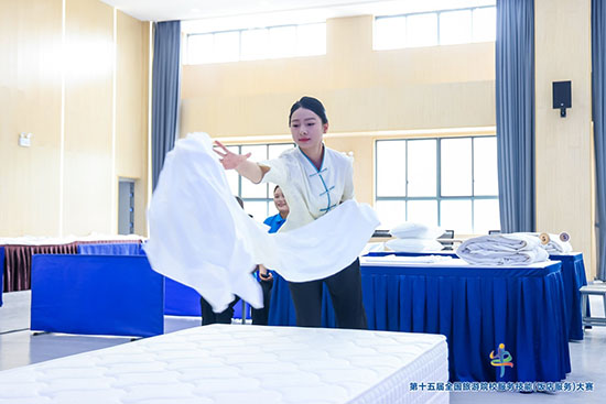 大賽分為三項內容。其一為綜合知識理論考核,采用機考方式,時長1小時,滿分為100分,重點考察選手的專業理論基礎知識及綜合分析能力。其二是英語水平測試,本科院校和高職高專院校組時間約5分鐘,中職學校組時間約3分鐘,滿分為100分,通過選手與評委現場會話,檢驗選手的英語口語表達能力。其三為現場操作,其中的中式鋪床環節,主要考察選手操作的熟練性、規范性。各項考核內容全面且細致,旨在選拔出綜合能力過硬的旅游專業人才。
