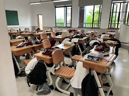 “地震來襲,緊急避險(xiǎn)!”全體師生迅速反應(yīng),以最快速度蹲至課桌下或角落里,雙手護(hù)頭、蜷縮身體,利用課桌、墻角等“生命三角區(qū)”緊急避險(xiǎn),以標(biāo)準(zhǔn)姿勢抵御可能的“墜物”傷害,全體進(jìn)入安全防護(hù)狀態(tài)。