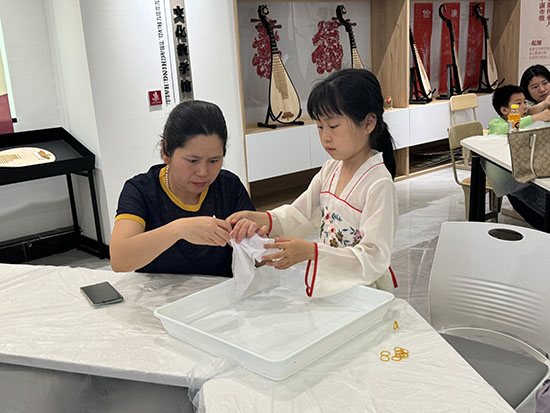 5月17日上午,平湖社區學院非遺教學館內洋溢著歡聲笑語,一場別開生面的“指尖上的非遺”——植物扎染親子體驗活動在這里舉行。此次活動旨在響應全省社區教育系統5月“家庭教育月”號召,增進社區家庭間的情感交流,推動社區家庭教育的和諧發展,同時傳承和弘揚我國傳統非遺文化。
