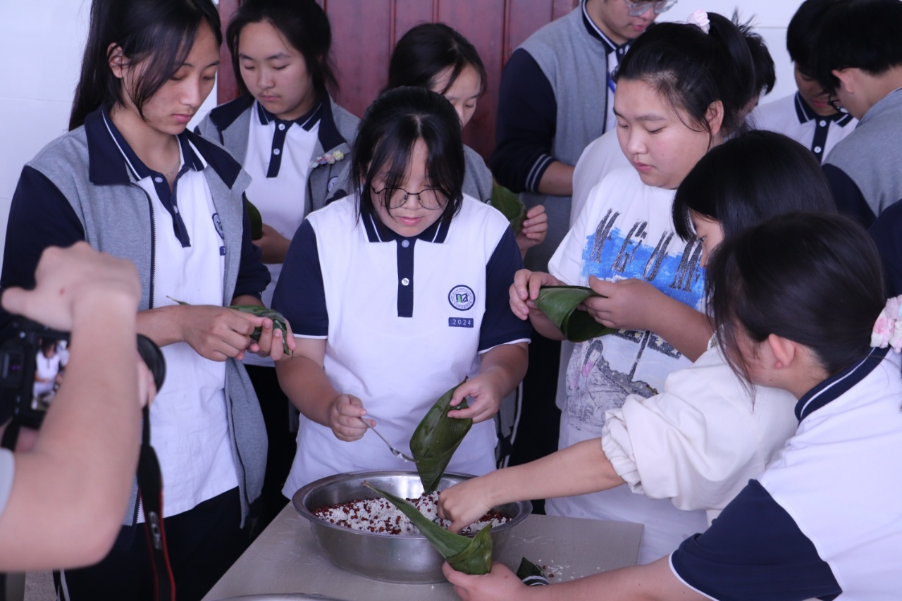 在老師們的耐心指導(dǎo)下,峨邊的同學(xué)們和紹興財(cái)經(jīng)旅游學(xué)校學(xué)子結(jié)成對(duì)子,躍躍欲試。雖然不少同學(xué)是初次嘗試,動(dòng)作稍顯生疏,粽葉也不那么“聽話”,但大家互相學(xué)習(xí)、彼此鼓勵(lì),現(xiàn)場(chǎng)氣氛熱烈非凡。折葉的專注、填米的認(rèn)真、纏繞的巧思……一雙雙年輕的手在粽葉與絲線間穿梭,歡聲笑語與粽葉清香交織彌漫。形態(tài)各異的粽子逐漸成型,三角的、四角的,雖不完美卻飽含心意,承載著兩地學(xué)子共同協(xié)作的快樂與友誼的甜蜜。