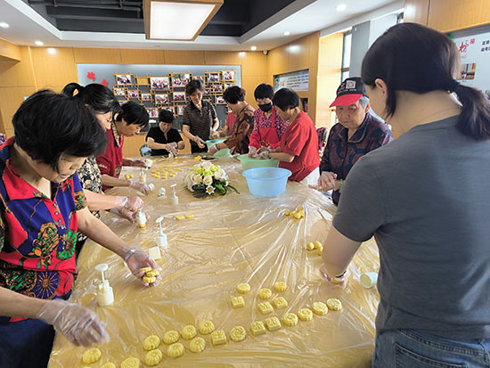 在實踐環節,社區工作人員提前備好低糖綠豆粉、模具及包裝禮盒,老人們戴上手套,化身“糕點師”。成校老師分組示范,從揉搓綠豆團到壓模定型,手把手指導細節。72歲的李奶奶與鄰居搭檔協作,一邊將綠豆泥填入蓮花紋模具,一邊笑道:“年輕時忙工作,現在和老姐妹一起做糕點,這可比買的有意義!”活動現場歡聲不斷,綠豆清香彌漫,不一會兒,蓮蓬、如意等造型精致的綠豆糕便擺滿桌案。