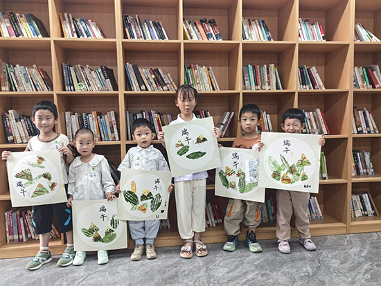 活動伊始,孩子們滿懷期待地圍坐在書桌旁。在老師的悉心指導下,孩子們開始了奇妙的手工創作之旅。他們拿起吹塑紙,專注地裁剪、塑形,不一會兒,一個個形態各異的“粽子”和“粽葉”便在小手中誕生。緊接著,孩子們小心翼翼地將涂好顏色的吹塑紙“粽子”“粽葉”按壓在宣卡紙上,輕輕拓印。隨著一次次的拓印,一幅幅獨一無二的作品躍然紙上。此時,孩子們并未停下創作的腳步,他們拿起黑色畫筆,為紙上的粽子添上靈動可愛的“小眼睛”。瞬間,原本平面的圖案仿佛被賦予了生命,變得鮮活又俏皮,充滿了濃郁的童趣。