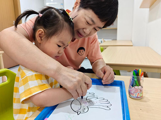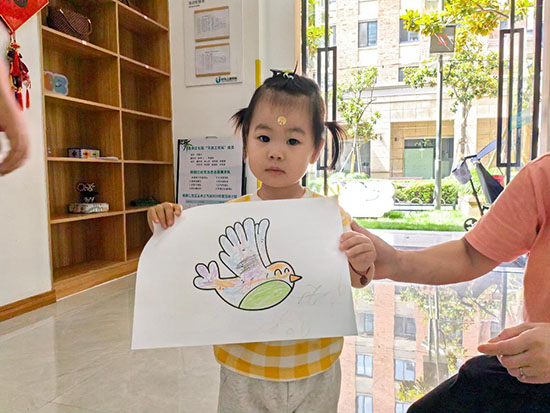 在“認識小動物”環節,老師借助精美的圖片和可愛的玩偶,向孩子們展示了麻雀、青蛙等芒種時節常見的小動物,讓孩子們對芒種的生態環境有了直觀的認識。投沙包游戲更是將課堂氛圍推向高潮,孩子們在選擇小動物進行投擲的過程中,不僅鍛煉了肢體協調能力,也進一步加深了對小動物的印象。“為小鳥穿新衣”繪畫活動中,孩子們拿起蠟筆,為小鳥模型涂上絢麗的色彩,寓意著芒種時節鳥兒換新羽。親子模仿環節則將氣氛推向高潮——家長與孩子化身為展翅欲飛的小鳥、蓄力跳躍的青蛙,在相視而笑的默契模仿里,將芒種的生命律動融入血脈相連的溫馨互動。