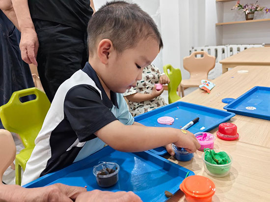 活動現場,輕快的音樂聲中,親子家庭共同完成趣味熱身操。孩子們模仿小動物蹦跳、伸展,家長們則耐心引導,歡聲笑語迅速點燃課堂氛圍。在創意粘土手工環節,孩子們化身“小小藝術家”,用彩色粘土為小魚貼上“鱗片”。“媽媽,我的小魚有彩虹色的衣服!”4歲的軒軒舉著作品向同伴展示,稚嫩的臉上滿是自豪。