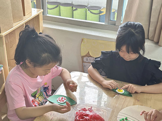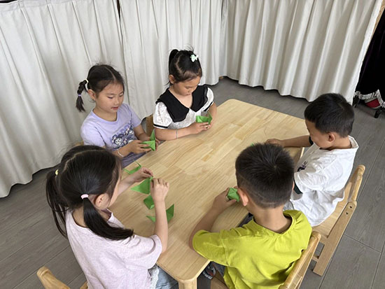 畫創意粽畫顯張力:畫上自己喜歡的圖案,先一折,再二折,接著三折,最后一個粽子變出來了。粘土紅豆粽:輕粘土揉一揉、按一按;再把紅豆放上去,壓一壓;接上兩片小粽葉;粘土紅豆粥就出現了。
