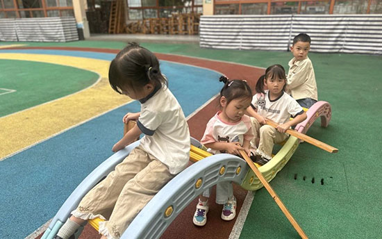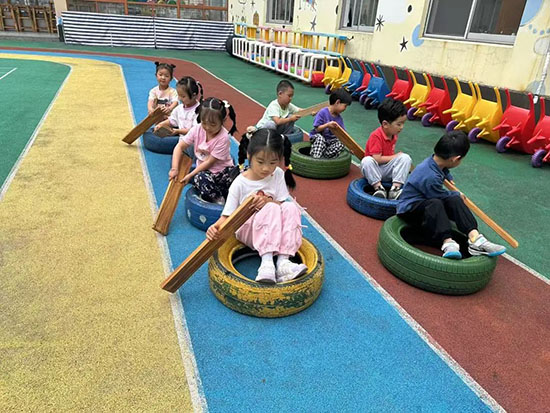 制花樣創搭賽龍舟:“我覺得可以用輪胎搭建龍舟。”“我們可以用小椅子一起做龍舟。”“積木塊也可以搭建龍舟。”利用多樣材料,想象創造,展現不同魅力,展示幼兒制作各具特色的三只龍舟。
