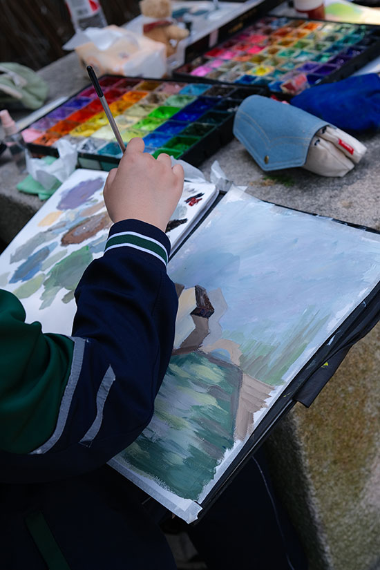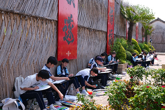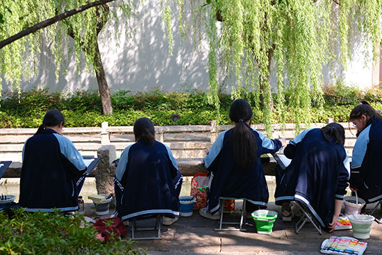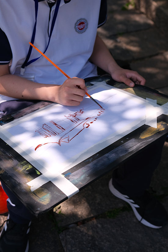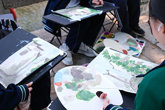 四五月春日的淺淺暖光,化作學生調色盤上的氤氳底色。濕漉漉的青石板映著白墻黛瓦,畫色彩風景的學生們用濕畫法暈染江南風景的層次——屋檐垂落的光線以嫩黃疊灰輕輕勾勒,爬山虎攀附的老墻以橄欖綠與赭石點染。學生們將課堂上所學習的透視知識運用到寫生實踐中,近處磚雕門樓的暖黃肌理逐漸過渡至遠處山墻的灰紫剪影,在虛實間構建小巷的深邃空間。有學生將油紙傘游動的鮮紅融入青灰主調,在畫面上濺起一抹跳動的春意。