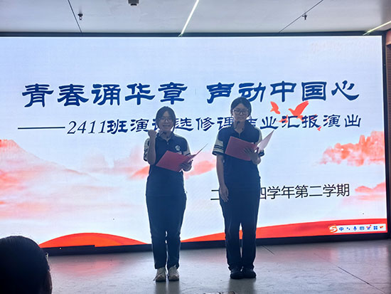 匯報演出圓滿收官,標志著為期一年的演講選修課行將結束,2411班全體同學用深鞠躬、“何老師,謝謝您”表達對指導老師的感恩與不舍之情。同學們表示:活動雖已結束,但課程賦予的自信表達、深刻思辨和文化認同,已深深融入他們的成長脈絡,成為他們面向未來的寶貴財富。未來,同學們將懷揣對語言藝術的熱愛,以更昂揚的姿態,向更好的自己踔厲奮發、勇毅前行。(華文浩)