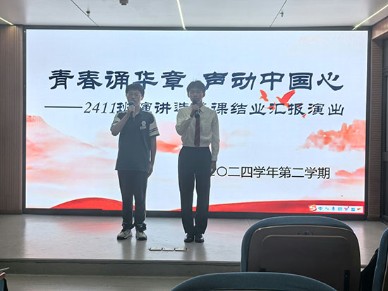 之后,學生代表何飛嫵、包唯先后上臺,分享演講選修課學習經歷與心得。作為該校2024年世界職業院校技能大賽“服裝設計與工藝”賽項斬獲銀獎的參賽團隊主講隊員、曾獲杭州市教育系統團干部主題微團課大賽一等獎的2023級“中本一體化”班郭芊瑞同學應邀來到現場,講述了自身的豐富演講經驗和逐夢路上的艱辛與喜悅,她勉勵學弟學妹們,用努力去探測自身能力的天花板。接著,她邀請指導教師何芳雨聯袂即興合誦《相信未來》。兩位深厚的語言功底、豐富的舞臺經驗、恰如其分的情感表達,呈現了一場精彩的視聽盛宴,贏得了陣陣掌聲。聞建明副校長代表學校對同學們在匯報演出中的高水平發揮給予充分肯定,并以艾青名作《我愛這土地》寄語全體同學:永葆赤子之心,在努力拼搏中綻放“中本一體3+4”彎道超車的光芒。