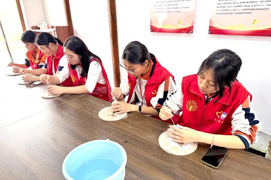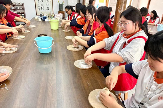 午后,同學們體驗了傳統陶藝的魅力。“泥沙入手經摶埴,光色便與尋常殊。”從遠古泥土到現代陶藝,陶器不僅是人類生活的必需品,更是歷史與文明的承載物。在了解陶瓷拉坯技術后,大家動手揉捏、拍打、塑形,在反復試驗中感受材質特性。拉坯的過程更需要保持專注、體會節奏。最終,一個個造型質樸、各具特色的陶藝作品在同學們手中成型,詮釋著泥土的生命與技藝的傳承。