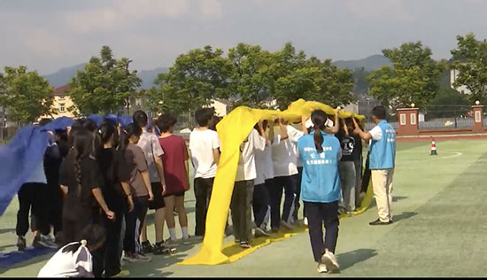 勇往直前:一條黃色圓形布帶,10位學生排成一列,雙手支撐布帶向前行走到達終點,用時短者為勝。布帶若要向前行進,10位學生必須步調一致、齊心協力。大多數布帶在手忙腳亂中緩慢前行,不一會兒,動作一致,紛紛到達終點。大家玩得很開心,從中知曉了單靠個人的力量是達不成目的的,需要團結一心,勁往一處用才能實現目標。“并肩前行”“鯉魚跳龍門”熱火朝天進行,眾人吶喊鼓勁。操場上洄蕩著青春的氣息,學生們充分感受到了濃濃的溫情、深深的感動和暖暖的力量。