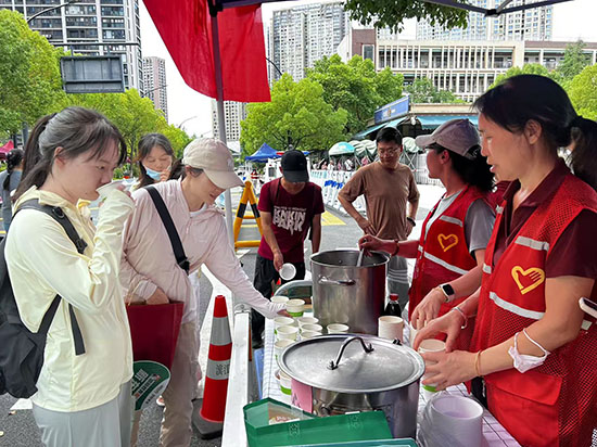 除了安排遮陽避雨棚之外,今年信誠社區還特別啟用了距考點150米的濱誠云府鄰里食堂作為家長休憩區,配備空調設備、充電設施、急救藥箱,并提供心理咨詢與陪伴服務。社區“信福糕點坊”同步推出傳統定勝糕,搭配現熬綠豆湯與冰鎮酸梅湯等消暑飲品,為考生及家長送上“旗開得勝”的美好祝愿。服務保障組構建起“清涼補給-應急處置-心理疏導”全鏈條服務體系,確保考生家長獲得全要素支持。