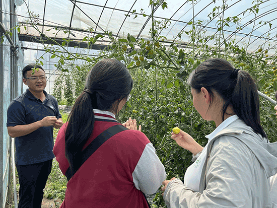 在白羊農場,師生們邊參觀邊聽取農場負責人黃通關于基地創建和運營的介紹,并開展了新品種番茄采摘體驗活動。