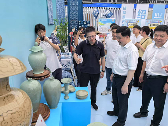展會當天,省人力社保廳黨組書記、廳長吳偉斌,廳黨組副書記、副廳長張旭明等領導蒞臨現(xiàn)場,深入各市級展區(qū)考察。在上虞區(qū)技工學校展位前,省市領導饒有興致地駐足,詳細聽取了學校參展作品的介紹。吳偉斌廳長對學校將人工智能融入技能教學的實踐模式表示高度贊賞,更對傳統(tǒng)與現(xiàn)代創(chuàng)意兼具的越窯青瓷作品贊嘆不已,充分肯定了學校專業(yè)建設方面取得的成效。他鼓勵學校繼續(xù)發(fā)揮優(yōu)勢,深化產(chǎn)教融合,為社會培養(yǎng)更多高素質(zhì)技能人才。