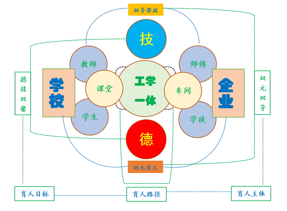 圖一 “工學一體,雙元雙導,德技雙馨”人才培養模式架構圖