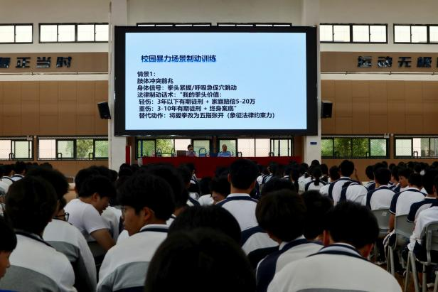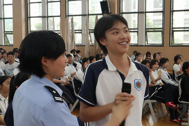 以“分享人生中的美好瞬間”團隊互動暖心開場。針對校園安全,謝警官給出實用建議:面對暴力侵害,切勿硬碰硬,應迅速脫離危險并尋求師長幫助;遭遇矛盾切忌以暴制暴,法律是維護權益的最佳武器。現場還通過情景模擬訓練,強化同學們的應急反應能力。