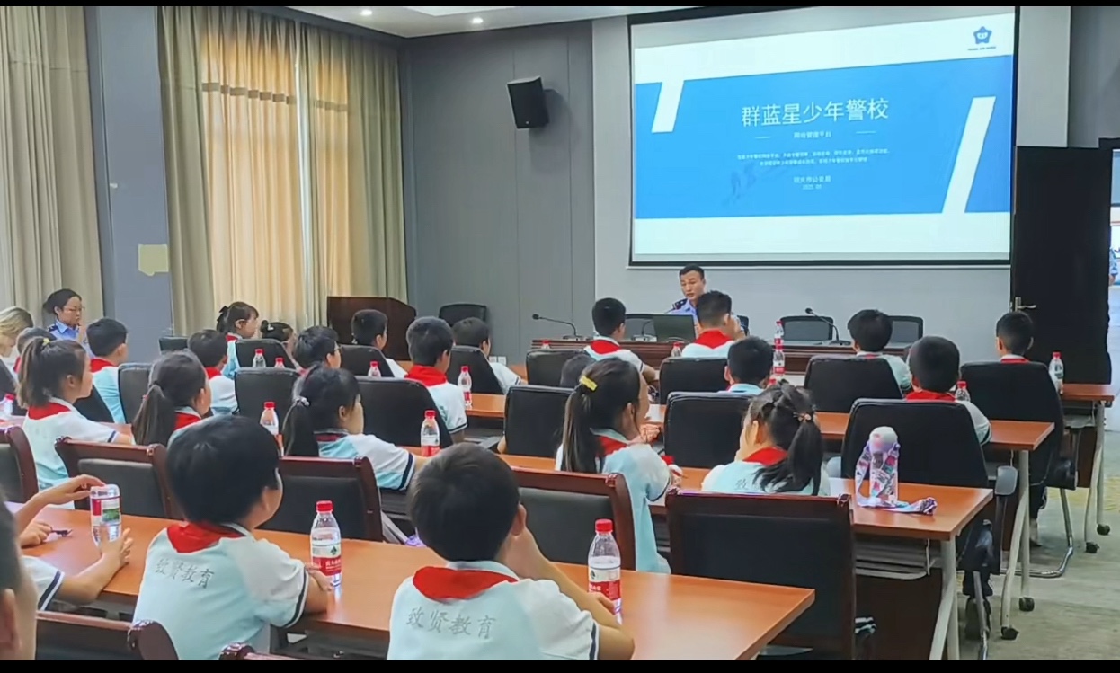 來到教室,傾聽周潔濤警官作《群藍星少年警?!返膱蟾妫芫俳榻B了警察這一職業的特殊性及其職責與義務,小小義警們專注地聽著,不時陷入沉思,深感自己肩上的責任重大,作為小小義警既要學習好,又要樹立“為人民服務”的思想。周警官對假期中的安全和反詐騙提出了要求。