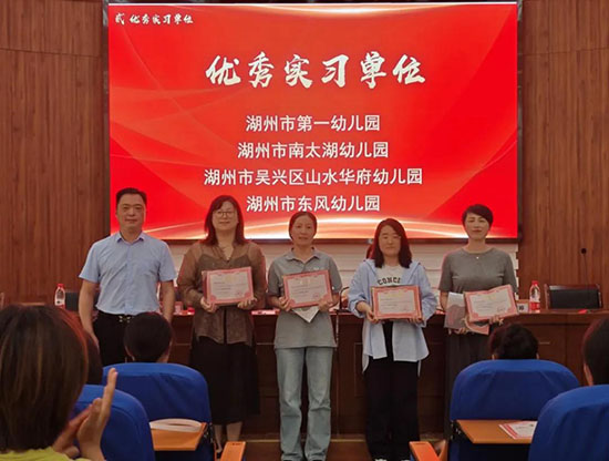 大會表彰了表現優異的17名學員和4家實習單位。湖州市第一幼兒園、南太湖幼兒園、東風幼兒園和吳興區山水華府幼兒園的園方代表共同為優秀學員頒發榮譽證書。黨委委員、副校長費永軍為湖州市第一幼兒園等4家單位授予“優秀實習單位”稱號。