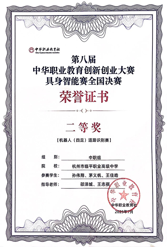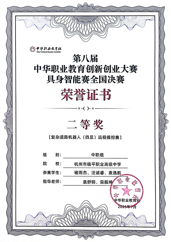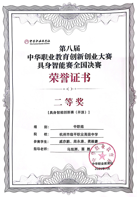 為發展新質生產力,推動具身智能領域的人才培養,第八屆中華職業教育創新創業大賽增設“具身智能賽道”。杭州市臨平職業高級中學創新創業教研組從四月的全國培訓會開始,積極備戰。創新創業教研組組織師生積極訓練,經過前期備賽、全國選拔賽,最終在全國總決賽中獲得佳績,五支隊伍全部獲獎,共取得 一等獎1項,二等獎3項,三等獎1項 。
