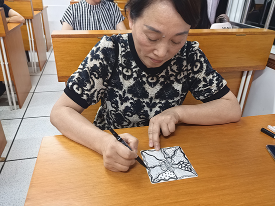課堂上,老師從基礎(chǔ)的線條和圖案教起,耐心講解禪繞畫的創(chuàng)作技巧和構(gòu)圖方法。學(xué)員們圍坐在一起,專注地握著畫筆,從最初的生澀到逐漸熟練,一個個充滿創(chuàng)意的圖案在畫紙上慢慢成形。有的學(xué)員將漁都的海浪元素融入作品,讓禪繞畫帶上了濃濃的地方特色;有的則通過自由發(fā)揮,釋放內(nèi)心的情緒,享受創(chuàng)作的樂趣。