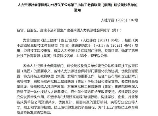 近日,人力資源和社會保障部公布第三批技工教育聯盟(集團)建設院校名單,浙江交通技師學院牽頭組建的“金華市汽車維修職業教育集團”成功入選,成為全國第三批33所技工教育聯盟(集團)建設院校之一。這是學校自2011年創建該職教集團以來,持續深化產教融合、創新集團化辦學的新的里程碑,標志著學校在服務國家技能人才培養、示范引領區域技工教育高質量發展上取得國家級認可。