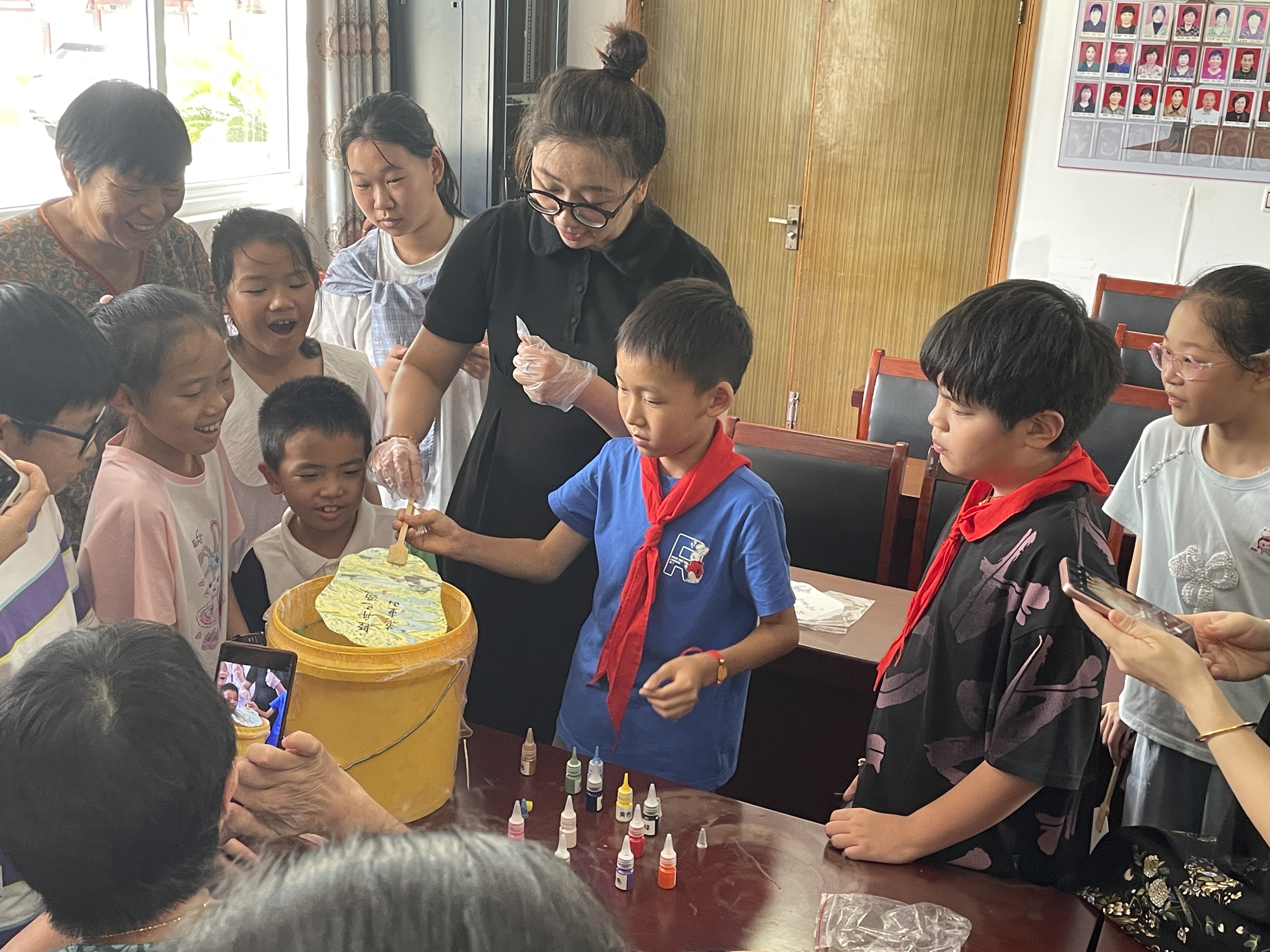 實踐環節點燃了現場的熱情,成為一次生動的終身學習實踐課。沈老師清晰示范后,親子家庭齊動手:將心儀的色彩滴入盛有八分滿清水的容器,看著漆液在水面自然暈開。孩子們或輕吹水面,或用竹簽小心引導,盆中漆液隨之變幻出流動的紋路。接著,大家手握素扇,全神貫注地調整角度,讓扇面輕觸水面——沉入、提轉,一氣呵成。神奇的漂漆工藝借用水面流動的肌理,呈現出柔和圓潤、連綿不絕的獨特圖案。最終,每一把扇面都獨一無二,或清新雅致,或絢麗多彩,凝結著親子合作的巧思與創意?;顒蝇F場,孩子們神情專注地投入創作,家長們則化身“學習伙伴”和“記錄者”,用手機捕捉珍貴瞬間,并不時交流著對傳統工藝的感悟,溫馨的親子互動氛圍與濃厚的學習氛圍相互交融。