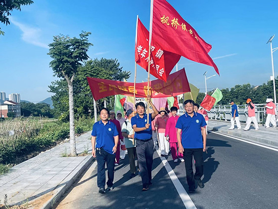 楓橋鎮老年體協秘書長王德良宣布活動流程。鎮內29個村(社區)的260多名成員兩路縱隊沿著楓店線到楓山線接口健步走,身著“全民優生活”贊助健身服的成員在“我運動 我健康 我快樂”的橫幅指領下精神抖擻地行進在人行道上,路人紛紛駐足觀望,極大地增強了人們“全民健身”的意識。