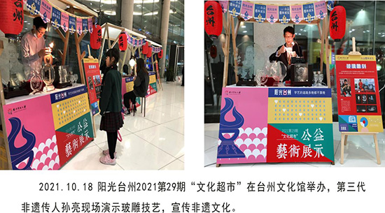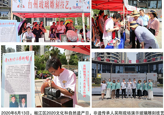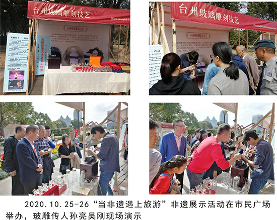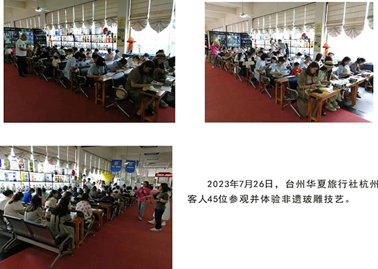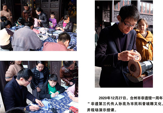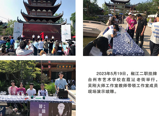 從2019年開始,“玻雕文化”書院每年都受邀參加了臺州市、椒江區(qū)及葭沚街道全民終身學(xué)習(xí)周活動,非遺傳承人攜精美的玻雕作品亮相。活動現(xiàn)場,非遺傳承人展示了精湛的玻雕技藝,吸引了不少觀眾駐足觀賞,為全民終身學(xué)習(xí)周活動注入了濃厚的文化底蘊。同時,不定期在非遺館、市民廣場、臺州市文化產(chǎn)業(yè)園、葭沚老街等公共場所展示、宣傳非遺文化,此外,還走出臺州,走出浙江交流、傳播“玻雕文化”,極大地推廣了“玻雕文化”,真正營造人人、時時、處處可學(xué)的全民終身學(xué)習(xí)氛圍。