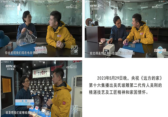 “玻雕文化”書院積極參與全民終身學(xué)習(xí)體系的構(gòu)建,由葭沚成校牽頭,以“玻雕文化”書院為載體,采取非物質(zhì)文化遺產(chǎn)的傳承與社會服務(wù)相結(jié)合的方式,服務(wù)全民終身學(xué)習(xí),到各個社區(qū)、文化禮堂、企業(yè)等進行非遺展示,讓群眾參與非遺體驗,讓非物質(zhì)文化為城市、為市民的生活添加色彩,傳承中華民族傳統(tǒng)技藝和豐富居民精神生活、提升居民文化自信的雙重價值,培養(yǎng)大國工匠精神,也為建設(shè)祖國的美好未來貢獻力量,2023年“玻雕文化”書院獲評臺州市全民終身學(xué)習(xí)品牌項目。書院自成立以來,社會影響力不斷擴大,各類各級媒體多次報道“玻雕文化”書院在全民終身學(xué)習(xí)中做的有益的嘗試,2023年4月21 日中央電視總臺在葭沚老街舉辦“推動共同富裕浙江研討會暨媒體行動”直播報道,“玻雕文化”書院負責(zé)人孫亮以非“遺潤童心,文化共傳承”為主題,在報道中宣傳介紹“玻雕文化”。習(xí)近平總書記任浙江省委書記時視察藝術(shù)館時多次談到,“這個藝術(shù)館辦得很好,很有自己的特色,希望你們一定要把技藝傳承下去,一代比一代更好”。國務(wù)院總理李強同志,全國人大常委會委員長趙樂際同志,中央政治局常委蔡奇同志,中央政治常委陳希同志,中央政治局委員陳敏爾同志,中央政治局委員黃坤明同志,原全國人大常委會委員長張德江同志,原全國政協(xié)主席賈慶林同志先后視察藝術(shù)館,他們有的留詞、題字和講話及合影。鞭策鼓勵吳氏的玻璃雕刻技藝,他們的鼓勵給了我們力量和信心,也是給我們中華民族的文化注入了自信與活力。玻璃雕刻藝術(shù)品曾作為“ 國禮 ”贈送墨西哥總統(tǒng)卡爾德龍、法國前總統(tǒng)希拉克、美國前總統(tǒng)老布什、克林頓、加拿大總理、聯(lián)合國前秘書長安南、潘基文等,并得到他們的回信及高度評價,“玻雕文化”走向了世界。