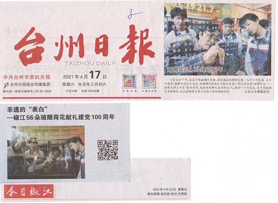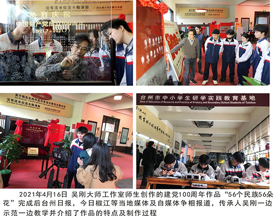 “玻雕文化”書院每年都在椒江非遺日、臺州市“鄉(xiāng)村名校”鄉(xiāng)土文化傳承與發(fā)展現(xiàn)場推進會、勞動節(jié)等不同場合舉行作品比賽、展示等活動,交流經(jīng)驗、點亮生活。2021年4月16日,“玻雕文化”書院師生創(chuàng)作的建黨100周年作品“56個民族56朵花”完成后臺州日報,今日椒江等當(dāng)?shù)孛襟w及自媒體爭相報道。書院成立以來,成果顯著,玻雕學(xué)員的作品在各類展覽和比賽累計獲得金獎10項,銀獎11項,銅獎3項,優(yōu)秀獎4項。