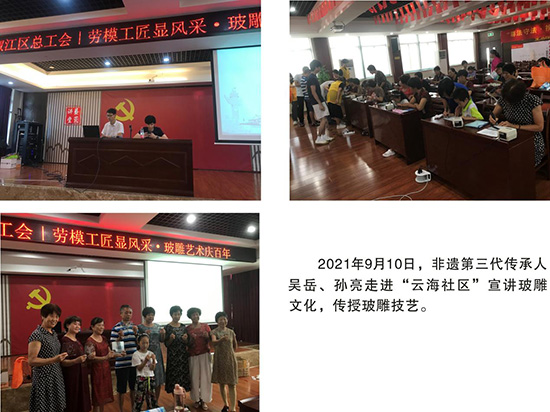 推進“玻雕文化”進企業(yè)活動。為全方位、多層次地傳播玻雕藝術(shù)文化,“玻雕文化”走進了葭沚街道10多個企業(yè),讓企業(yè)職工體驗“玻雕文化”魅力,讓非遺與科技碰撞出不一樣的火花,在傳播繼承非遺的同時,推陳出新,打破傳統(tǒng)壁壘,讓“非遺之花”開得更加艷麗,詮釋大國工匠精神。對全民終身學(xué)習(xí)活動進企業(yè)進行了有益的嘗試,得到了廣大職工普遍歡迎。
