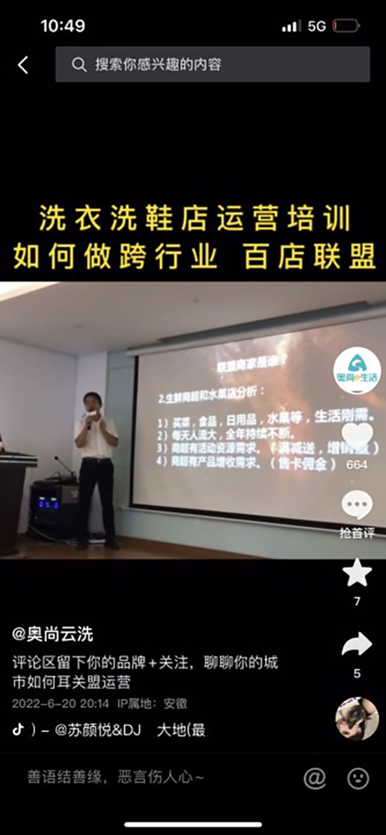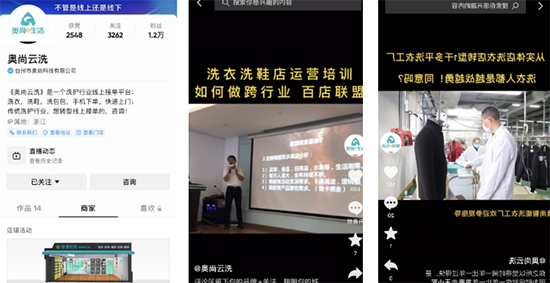 朱溪鎮(zhèn)社區(qū)學(xué)校通過(guò)與臺(tái)州奧尚科技有限公司等企業(yè)合作,拓寬培訓(xùn)資源,為學(xué)員們介紹智能洗衣,解決傳統(tǒng)干洗店無(wú)法提供“24小時(shí)”服務(wù)的弊端,強(qiáng)化村民市場(chǎng)運(yùn)營(yíng)觀念和能力。同時(shí)朱溪鎮(zhèn)社區(qū)學(xué)校與臺(tái)州市奧尚科技有限公司攜手成立校外培訓(xùn)實(shí)踐基地,增設(shè)實(shí)體店體驗(yàn)項(xiàng)目、運(yùn)營(yíng)實(shí)習(xí)項(xiàng)目以及加盟連鎖幫扶項(xiàng)目,三大項(xiàng)目有效的提升了培訓(xùn)實(shí)效。2022年,雙方加深協(xié)作,為洗染行業(yè)提供線上線下技能與運(yùn)營(yíng)培訓(xùn),同時(shí)打造抖音“浙江洗衣洗鞋,浙里洗”線上平臺(tái)獨(dú)立入口,為洗染行業(yè)經(jīng)營(yíng)戶提供線上抖音直播培訓(xùn)培訓(xùn)和運(yùn)營(yíng)幫扶服務(wù),突破傳統(tǒng)行業(yè)服務(wù)店鋪周邊2公里的業(yè)務(wù)局限,不斷向全省市拓展,甚至服務(wù)全國(guó)業(yè)務(wù)。如圖所示:共富課堂奧尚云洗培訓(xùn)抖音直播。